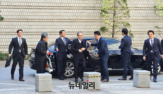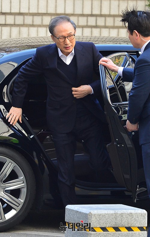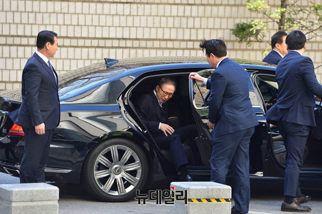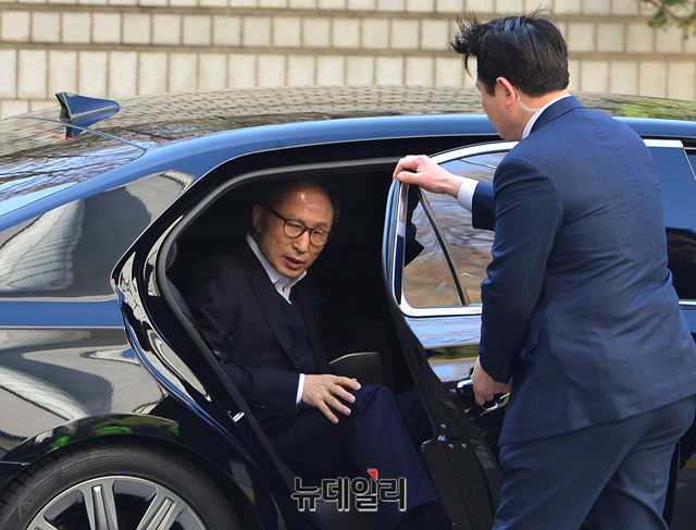 이명박 전 대통령이 석방 일주일만인 13일 오후 서울 서초구 서울고등법원에서 열린 공판에 출석하기 위해 차량에서 내리고 있다.
