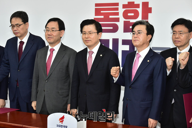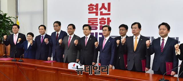 자유한국당 '좌파독재저지특별위원회' 임명장 수여식이 14일 오전 국회에서 열린 가운데 황교안 대표 및 김태흠 위원장 등 소속의원들이 기념사진을 촬영하고 있다.