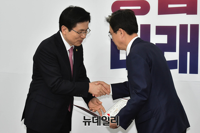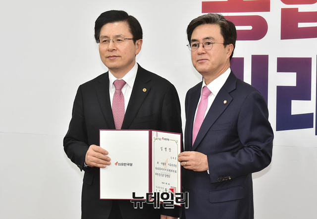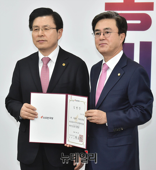 황교안 자유한국당 대표가 14일 오전 국회에서 김태흠 '좌파독재저지특별위원회' 위원장에게 임명장을 수여하고 있다.