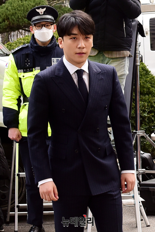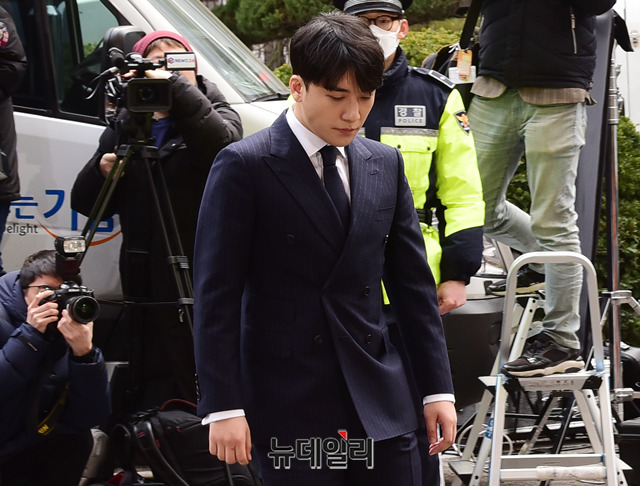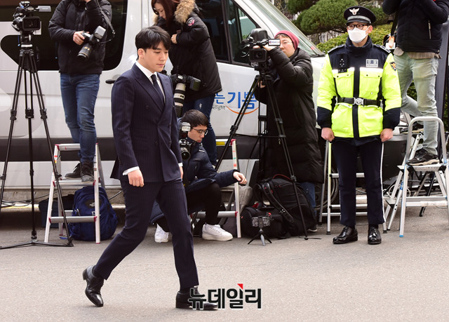 해외 투자자에게 성접대 의혹 등을 받고 있는 가수 승리가 14일 오후 서울 종로구 서울지방경찰청에 조사를 받기 위해 출석하고 있다.