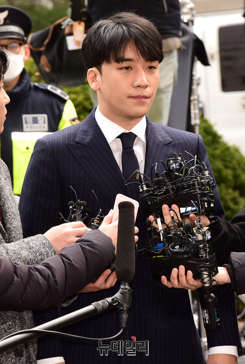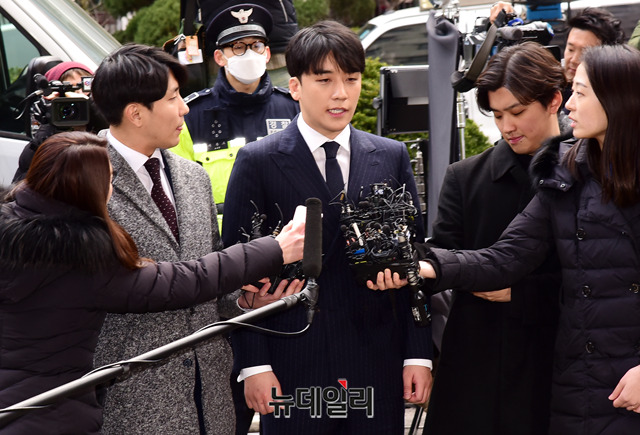 해외 투자자에게 성접대 의혹 등을 받고 있는 가수 승리가 14일 오후 서울 종로구 서울지방경찰청에 입장하며 취재진의 질문에 답하고 있다.