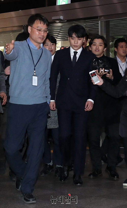 해외 투자자에게 성접대 의혹 등을 받고 있는 가수 승리가 14일 오후 서울 종로구 서울지방경찰청에 조사를 받기 위해 출석하고 있다.
