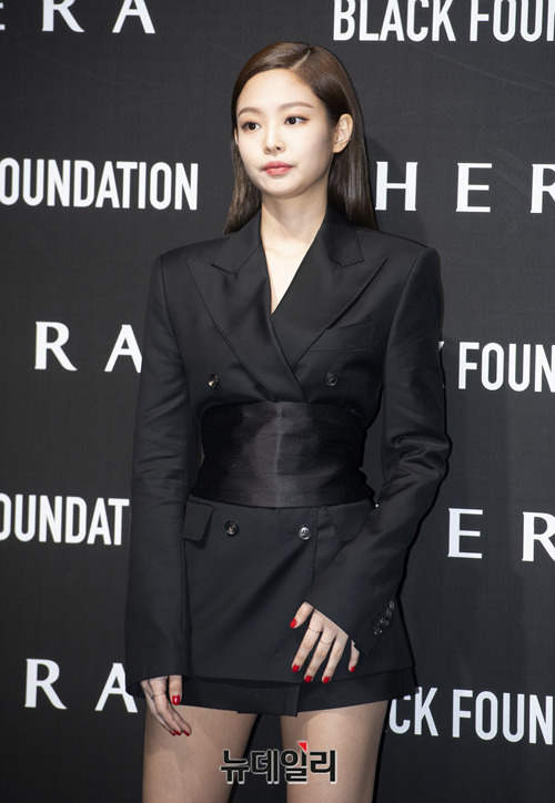 걸그룹 블랙핑크 멤버 제니가 14일 오후 서울 강남구 SJ쿤스트할레에서 진행된 '블랙 파운데이션' 신제품 론칭 기념 행사에서 포토타임을 갖고 있다. 블랙 파운데이션은 총 12가지 색으로 구성됐다. 4월 1일부터 판매.