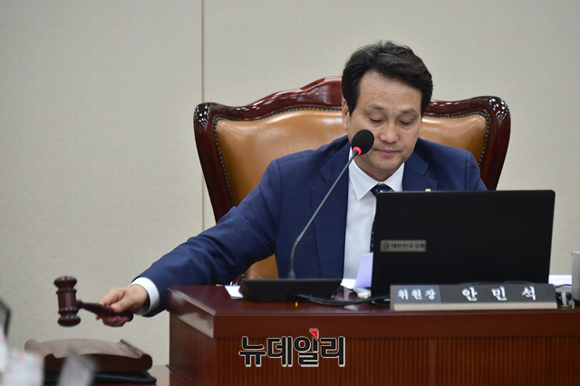 안민석 문화체육관광위원회 위원장이 15일 오전 국회에서 열린 문체위 전체회의에서 의사진행을 하고 있다.