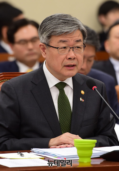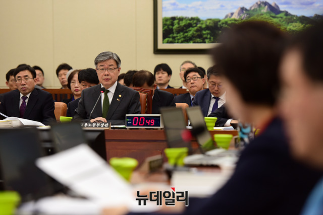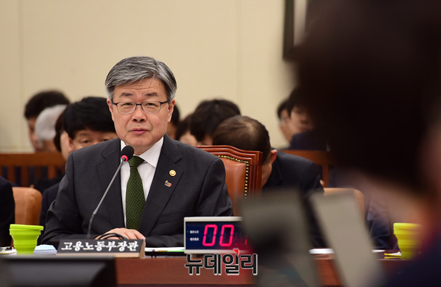 이재갑 고용노동부 장관이 15일 오전 국회에서 열린 국회 환경노동위원회 전체회의에서 질의에 답하고 있다.