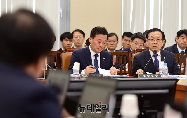 이진복 자유한국당 의원이 15일 오후 국회에서 열린 행정안전위원회 전체회의에서 정문호 소방청장에게 질의를 하고 있다.