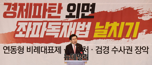 황교안 자유한국당 대표가 18일 오전 국회 헌정기념관 대강당에서 열린 국회의원 및 당협위원장 비상 연석회의에서 모두발언을 하고 있다.