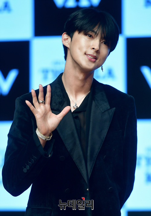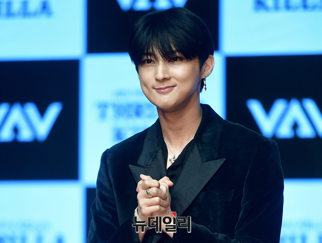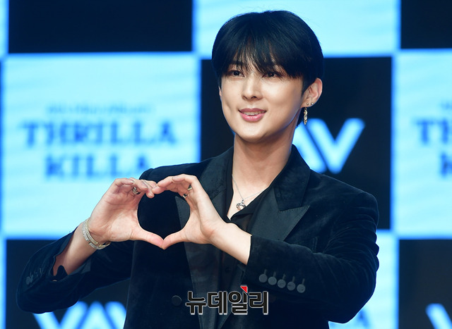 아이돌그룹 'VAV(브이에이브이)' 멤버 에이스가 18일 오후 서울 강남구 일지아트홀에서 열린 4번째 미니앨범 'Thrilla Killa(쓰릴라 킬라)' 쇼케이스에서 포토타임을 갖고 있다. VAV는 2015년에 데뷔해 2017년 현재의 멤버로 팀을 재정비 했다.