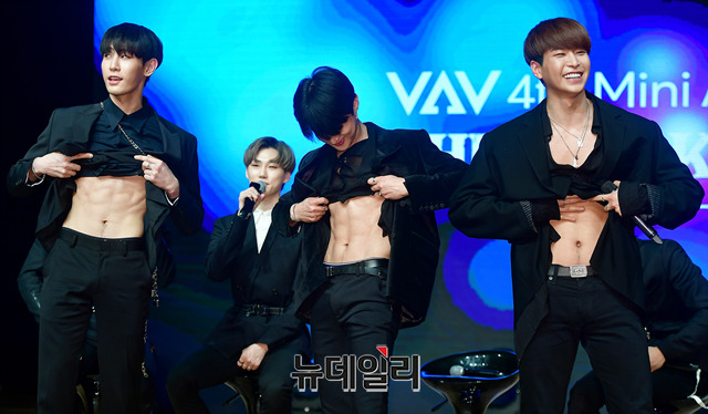 아이돌그룹 'VAV(브이에이브이)'가 18일 오후 서울 강남구 일지아트홀에서 열린 4번째 미니앨범 'Thrilla Killa(쓰릴라 킬라)' 쇼케이스에서 복근을 공개하고 있다. VAV는 2015년에 데뷔해 2017년 현재의 멤버로 팀을 재정비 했다.