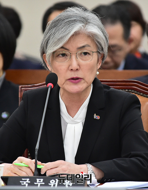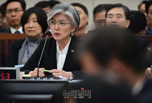 강경화 외교부 장관이 18일 국회에서 열린 외교통일위원회 전체회의에서 의원들의 질문에 답하고 있다.