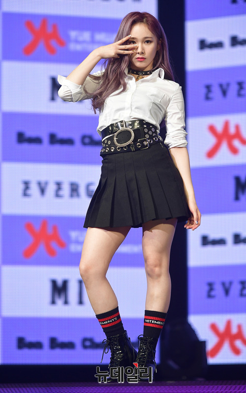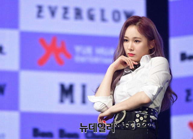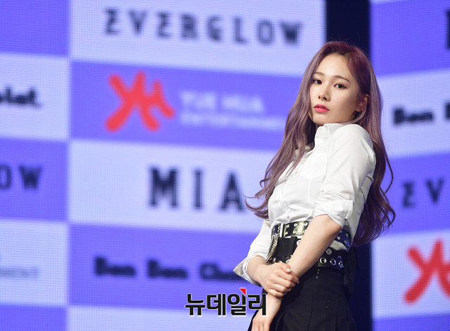 신인걸그룹 '에버글로우' 멤버 미아가 18일 오후 서울 광진구 예스24라이브홀에서 열린 데뷔쇼케이스에서 포토타임을 갖고 있다.