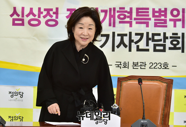 심상정 정치개혁특별위원회 위원장이 19일 오전 국회에서 열린 법안설명 기자간담회를 위해 입장하고 있다.