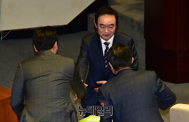 장병완 민주평화당 원내대표가 19일 오후 국회에서 열린 본회의에서 비교섭단체 대표연설을 마치고 동료의원들과 인사를 나누고 있다.