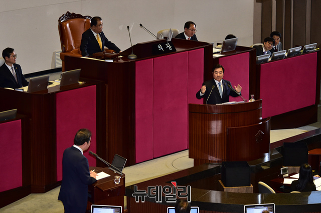 이석현 더불어민주당 의원이 19일 오후 국회에서 열린 본회의에서 대정부질문을 하고 있다.