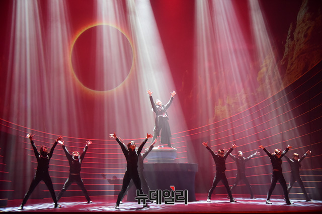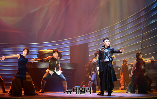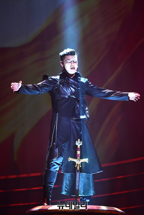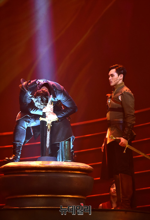 뮤지컬 배우 강홍석이 19일 오후 서울 중구 충무아트센터에서 열린 뮤지컬 '킹아더' 프레스콜에서 열연하고 있다. '킹아더'는 자신의 진짜 신분을 모른 채 살아가던 '아더'가 우연한 기회로 바위에 박힌 엑스칼리버를 뽑고 왕으로 즉위한 이후의 이야기를 다룬다.