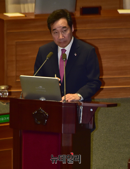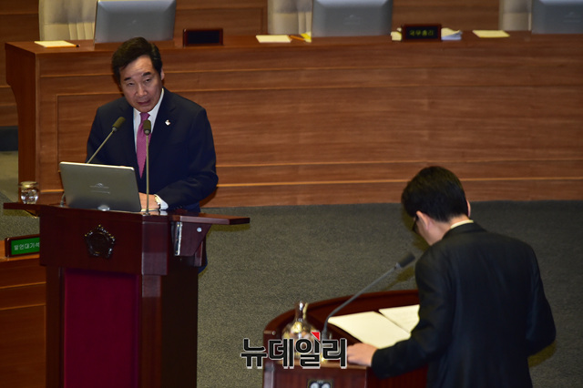 이낙연 국무총리가 19일 오후 국회에서 열린 본회의 정치 분야 대정부질문에 출석해 의원들의 질문에 답변하고 있다.