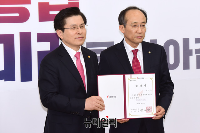 황교안 자유한국당 대표가 19일 오전 국회에서 열린 주요 당직자 임명장 수여식 및 4. 3 필승 선거대책회의에서 추경호 전략기획부총장에게 임명장을 준 후 기념촬영을 하고 있다.