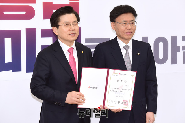 황교안 자유한국당 대표가 19일 오전 국회에서 열린 주요 당직자 임명장 수여식 및 4. 3 필승 선거대책회의에서 최교일 법률자문위원회 위원장에게 임명장을 준 후 기념촬영을 하고 있다.