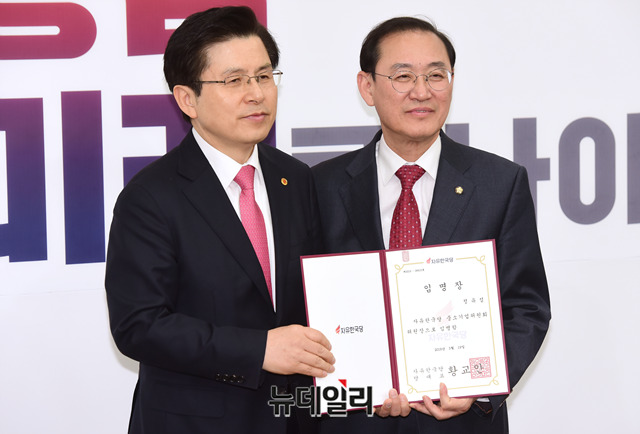 황교안 자유한국당 대표가 19일 오전 국회에서 열린 주요 당직자 임명장 수여식 및 4. 3 필승 선거대책회의에서 정유섭 중소기업위원회 위원장에게 임명장을 준 후 기념촬영을 하고 있다.
