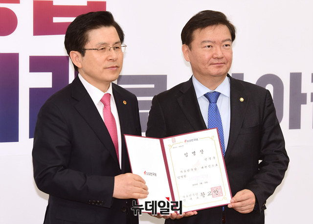 황교안 자유한국당 대표가 19일 오전 국회에서 열린 주요 당직자 임명장 수여식 및 4. 3 필승 선거대책회의에서 민경욱 대변인에게 임명장을 준 후 기념촬영을 하고 있다.