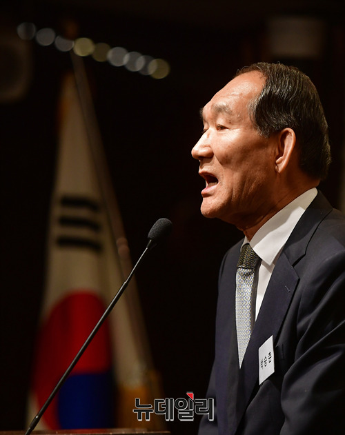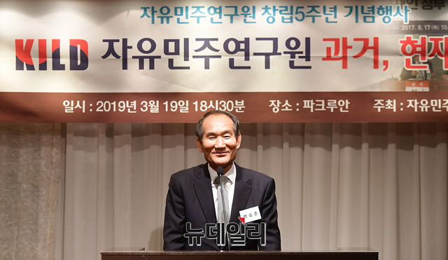 박승춘 전 국가보훈처장이 19일 오후 서울 강남구의 한 식당에서 열린 자유민주연구원 창립 5주년 기념행사에서 인사말을 하고 있다.