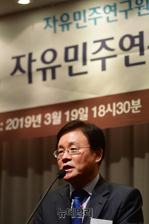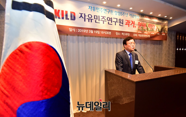 유동열 자유민주연구원장이 19일 오후 서울 강남구의 한 식당에서 열린 자유민주연구원 창립 5주년 기념행사에서 인사말을 하고 있다.