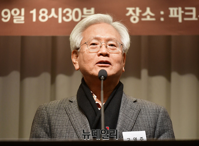 고영주 변호사가 19일 오후 서울 강남구의 한 식당에서 열린 자유민주연구원 창립 5주년 기념행사에서 인사말을 하고 있다.