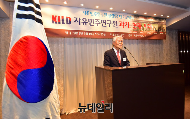 조갑제 조갑제닷컴 대표가 19일 오후 서울 강남구의 한 식당에서 열린 자유민주연구원 창립 5주년 기념행사에서 축사를 하고 있다.