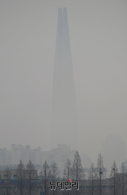서울지역 초미세먼지 주의보가 발령된 20일 오전 서울 강남구 코엑스에서 본 롯데월드타워. 짙은 미세먼지로 아래층 부분이 희미하게 관측된다. 기상청은 이날 오후 늦게부터 비가 내릴것으로 예보했다.