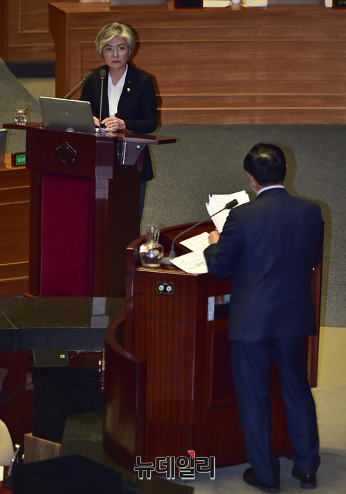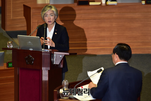 강경화 외교부장관이 20일 오후 국회 본회의장에서 열린 외교·통일·안보분야 대정부질문에서 의원들의 질문에 답하고 있다.