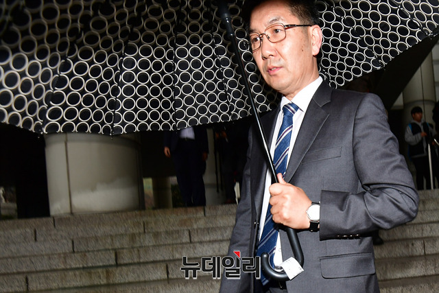 이병모 전 청계재단 사무국장이 20일 오후 서울 서초구 서울고등법원에서 열린 이명박 전 대통령의 재판에 증인으로 참석해 재판을 마친 직후 법원을 나서고 있다.