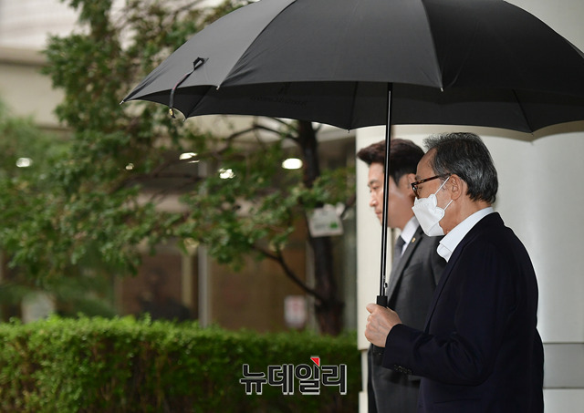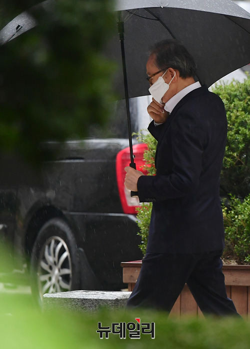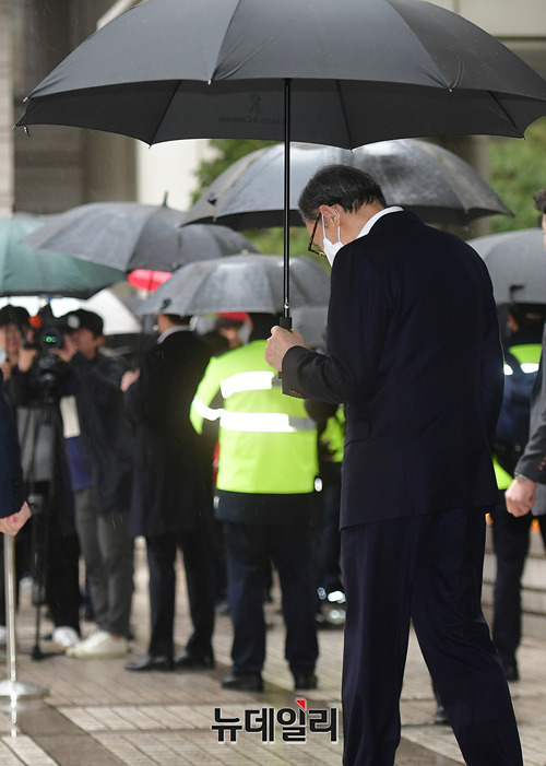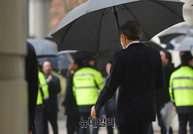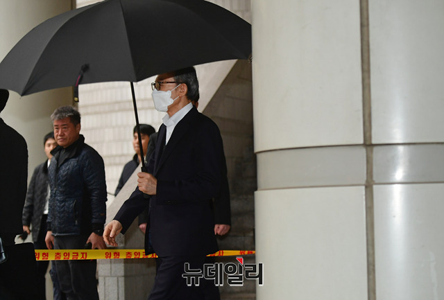 이명박 전 대통령이 20일 오후 서울 서초구 서울고등법원에서 열린 재판을 마치고 법원을 나서고 있다. 이 전 대통령은 우산을 쓰고, 기다리고 있던 지지자들과 눈을 마주치기도 했다.