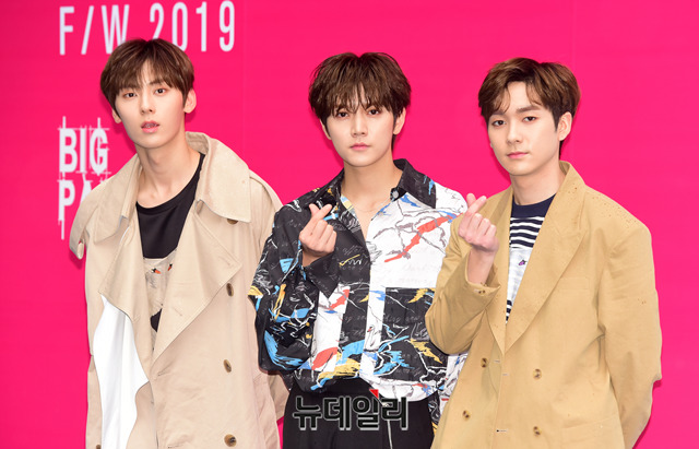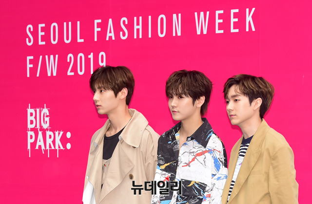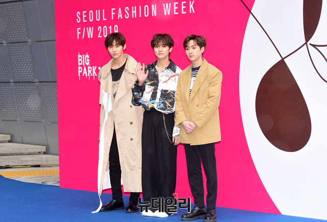가수 렌, 민현, 아론이 20일 오후 서울 중구 동대문디자인플라자에서 열린 '2019 가을/겨울 서울패션위크'에서 포토타임을 갖고 있다.