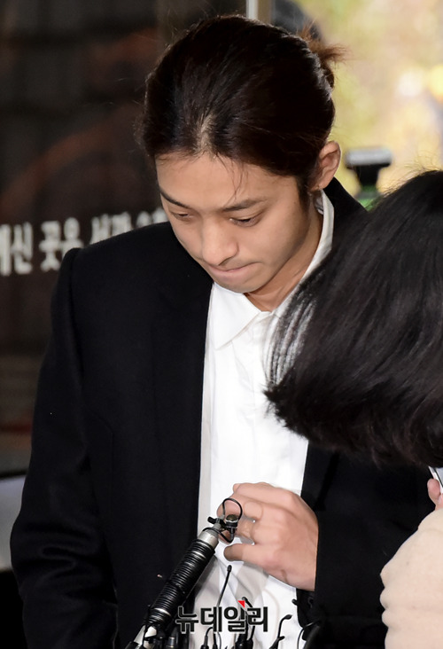 성폭력 범죄의 처벌 등에 관한 특례법 위반 혐의로 구속영장이 청구된 가수 정준영이 21일 오전 서울 서초구 중앙지방법원으로 영장실질심사를 받기 위해 출석하고 있다.