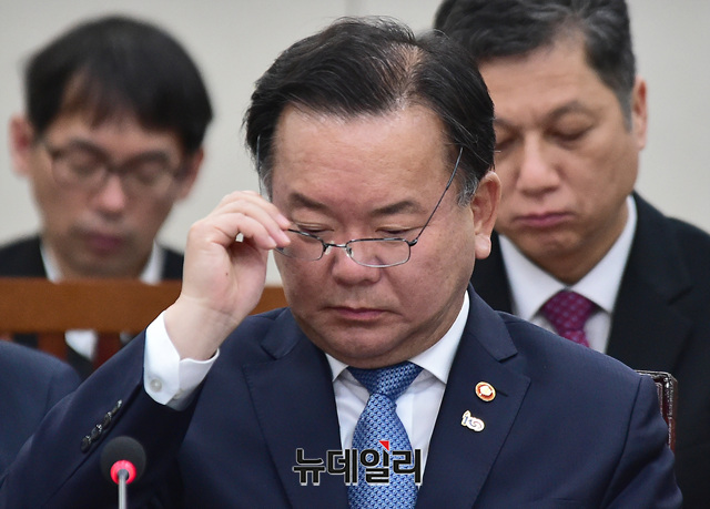 김부겸 행정안전부 장관이 21일 오전 국회에서 열린 남북경제협력특위 전체회의에 참석해 얼굴을 만지고 있다.