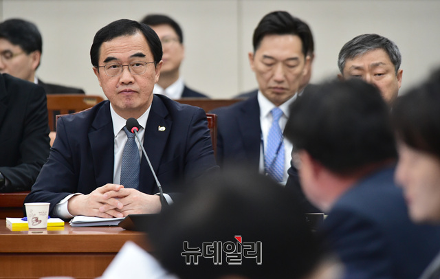 조명균 통일부 장관이 21일 오전 국회에서 열린 남북경제협력특위 전체회의에 참석해 의원들의 질문에 답변하고 있다.