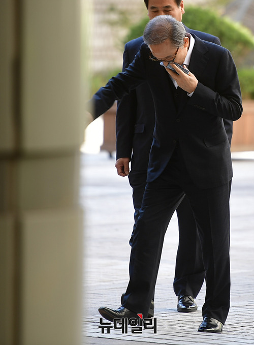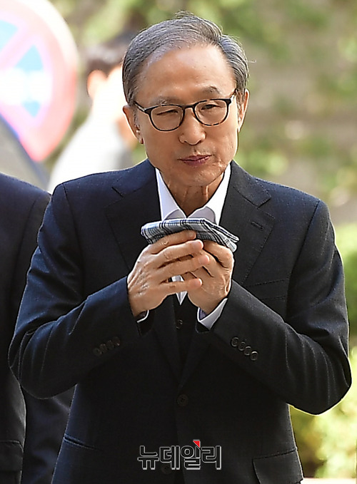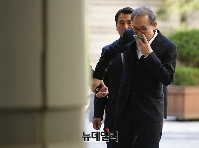 이명박 전 대통령이 22일 오후 서울 서초구 서울고등법원에서 열린 재판에 참석하기 위해 법정으로 향하면서 기둥에 손을 뻗어 기대고 있다. 또 법정으로 향하는 동안 뒤에 걷던 경호원의 손을 잡기도 했다.