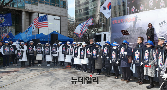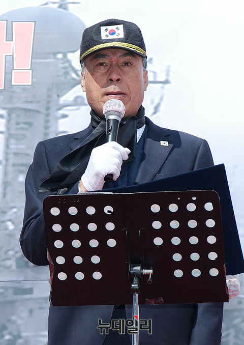 김경식 대한민국애국단체총연합 부총재가 23일 오후 서울 종로구 동화면세점 앞에서 일파만파애국자총연합 주최로 열린 '천안함 9주기' 국민추도식 행사에서 개회 선언을 하고 있다.