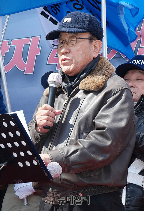 정광작 전국구국동지회 회장이 23일 오후 서울 종로구 동화면세점 앞에서 일파만파애국자총연합 주최로 열린 '천안함 9주기' 국민추도식 행사에서 대회사를 하고 있다.