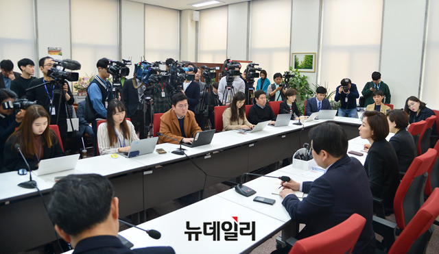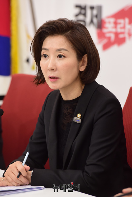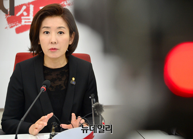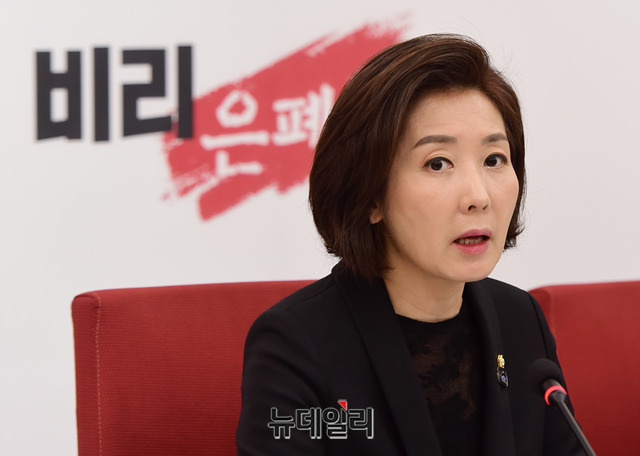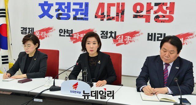 나경원 자유한국당 원내대표가 25일 오전 국회 원내대표실에서 열린 기자간담회에서 모두발언을 하고 있다. 이날 나 원대대표는 포항 지진피해 조치에 대한 현 정권을 규탄하며 '포항 지진 복구 지원 특별법'을 추진하겠다고 밝혔다.