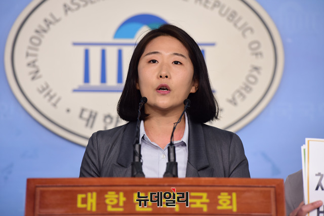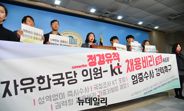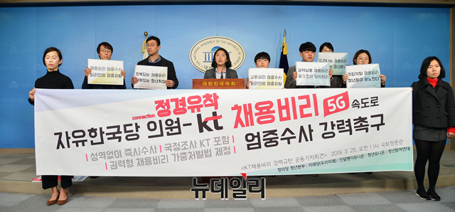 김소희 미래당 공동대표와 정의당 청년본부, 민달팽이유니온, 청년유니온, 청년참여연대가 25일 오전 국회 정론관에서 기자회견을 갖고 자유한국당 의원과 KT 채용비리에 관해 엄중수사를 촉구하고 있다.