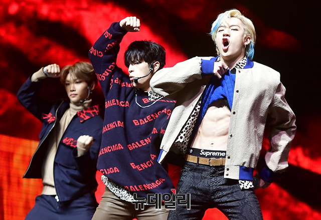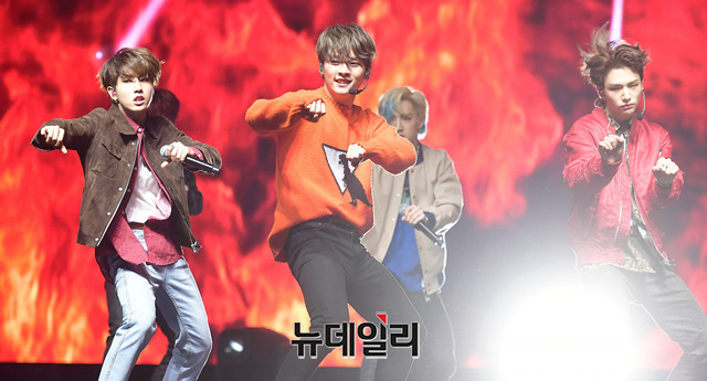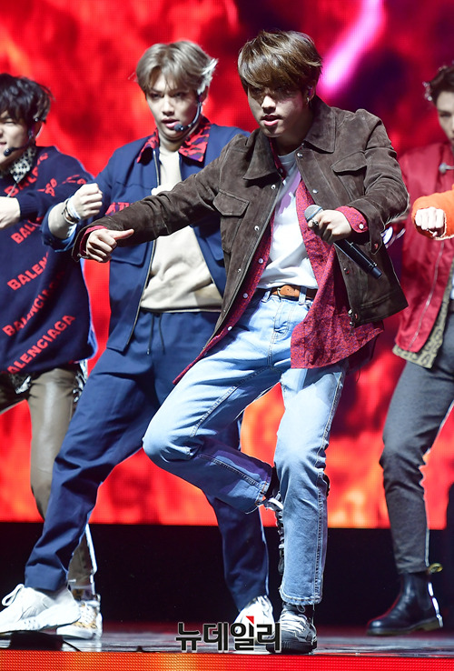 아이돌그룹 '스트레이키즈(Stray Kids)'가 25일 오후 서울 광진구 예스24라이브홀에서 미니앨범 '클레 원:미로' 쇼케이스 무대에서 수록곡 무대를 선보이고 있다.