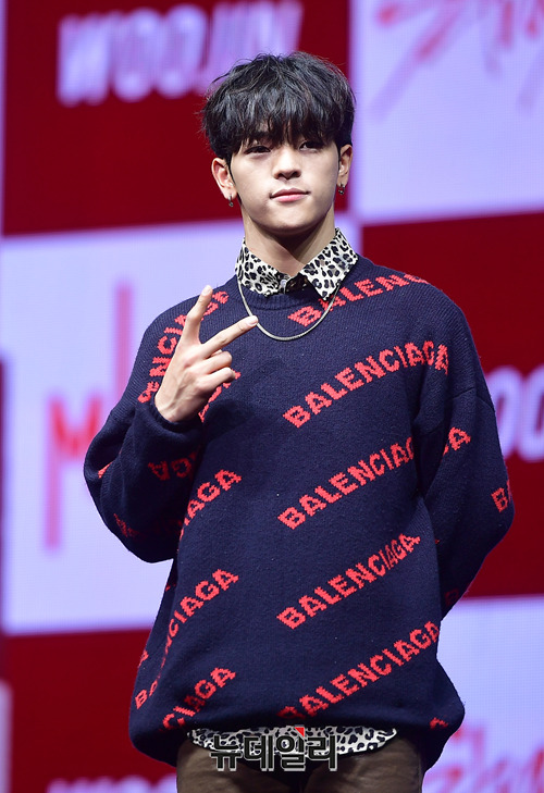 아이돌그룹 '스트레이키즈(Stray Kids)' 멤버 우진이 25일 오후 서울 광진구 예스24라이브홀에서 미니앨범 '클레 원:미로' 쇼케이스 무대에서 포토타임을 갖고 있다.