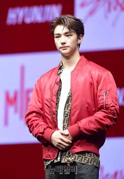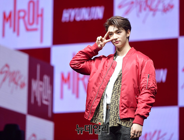 아이돌그룹 '스트레이키즈(Stray Kids)' 멤버 현진이 25일 오후 서울 광진구 예스24라이브홀에서 미니앨범 '클레 원:미로' 쇼케이스 무대에서 포토타임을 갖고 있다.