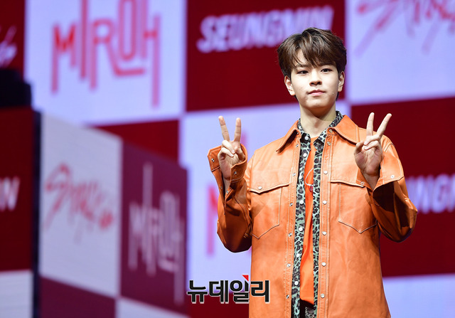 아이돌그룹 '스트레이키즈(Stray Kids)' 멤버 승민이 25일 오후 서울 광진구 예스24라이브홀에서 미니앨범 '클레 원:미로' 쇼케이스 무대에서 포토타임을 갖고 있다.