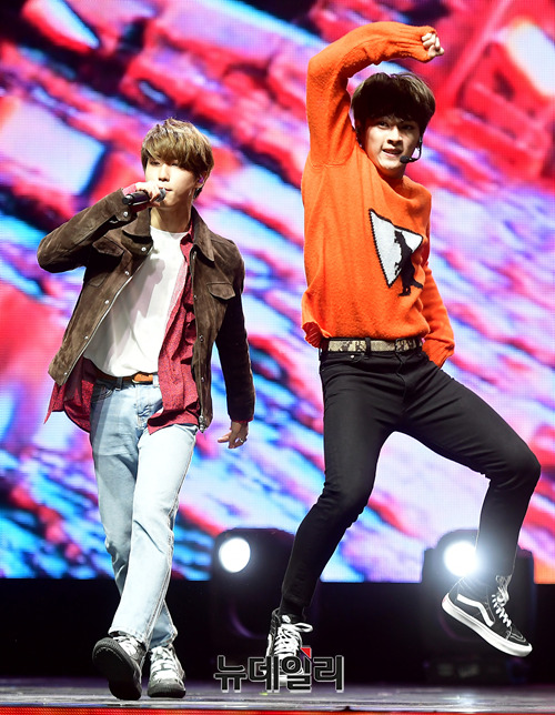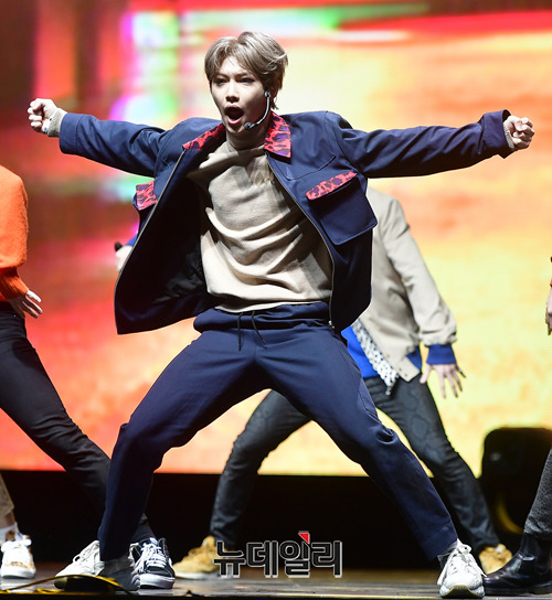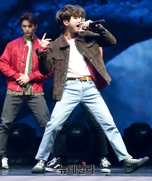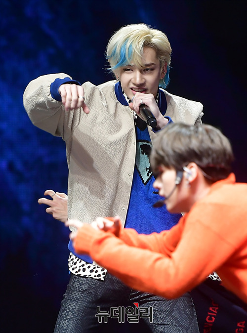 아이돌그룹 '스트레이키즈(Stray Kids)'가 25일 오후 서울 광진구 예스24라이브홀에서 미니앨범 '클레 원:미로' 쇼케이스에서 수록곡 무대를 선보이고 있다.