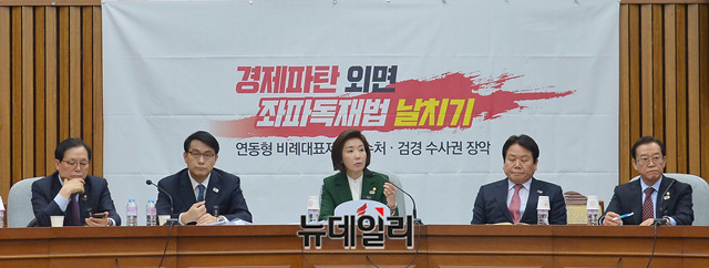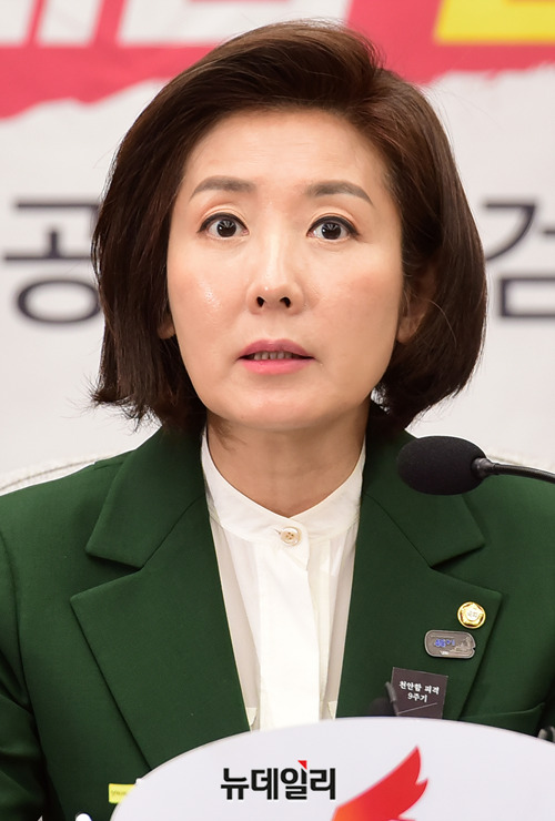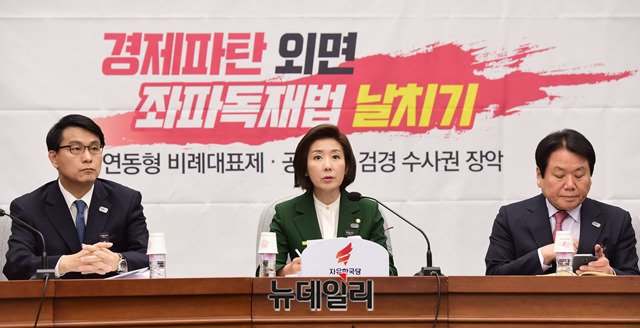 나경원 자유한국당 원내대표가 26일 오전 국회에서 열린 원내대책회의에서 모두발언을 하고 있다. 이날 나 원내대표는 4.3보궐선거 좌파 단일화를 규탄하며, 선거 승리로 답하겠다고 말했다.