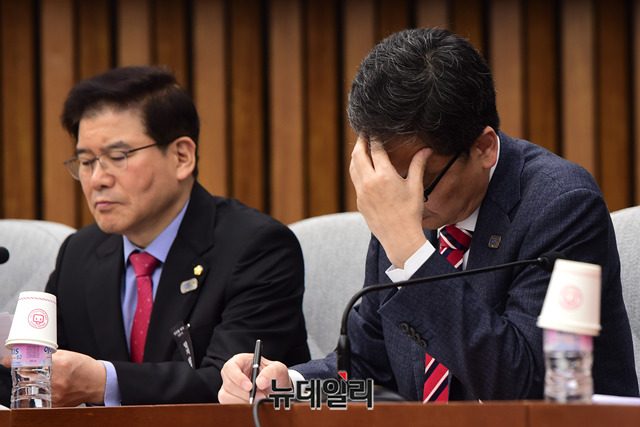곽상도 자유한국당 의원이 26일 오전 국회에서 열린 원내대책회의에서 나경원 원내대표의 발언을 듣고 있다.