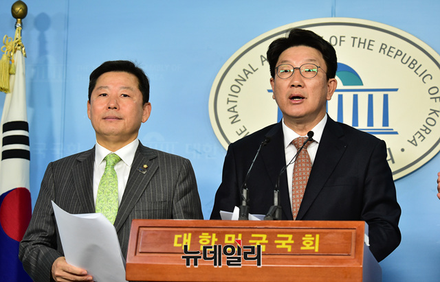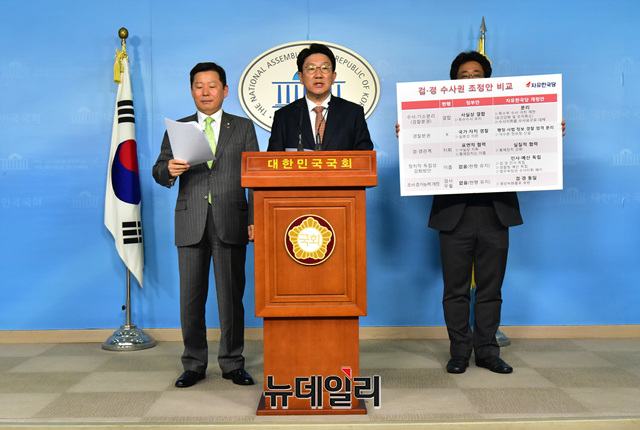 권성동 자유한국당 사법개혁특별위원회 위원장과 이철규 의원이 26일 오후 국회 정론관에서 기자회견을 갖고 한국당 검경수사권 조정안을 발표하고 있다.