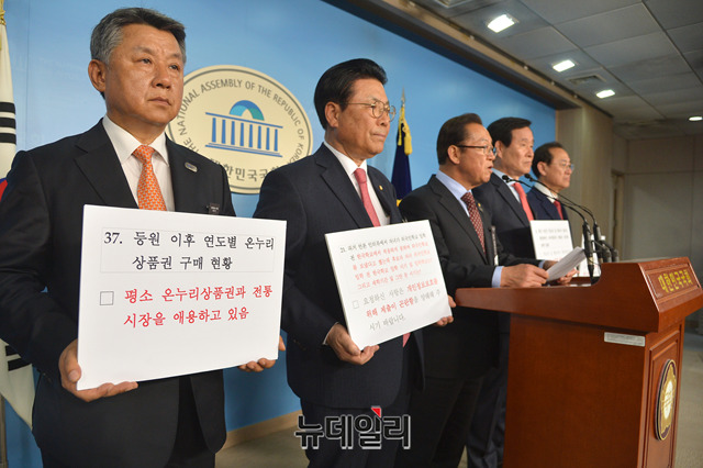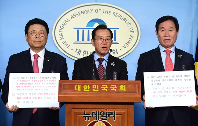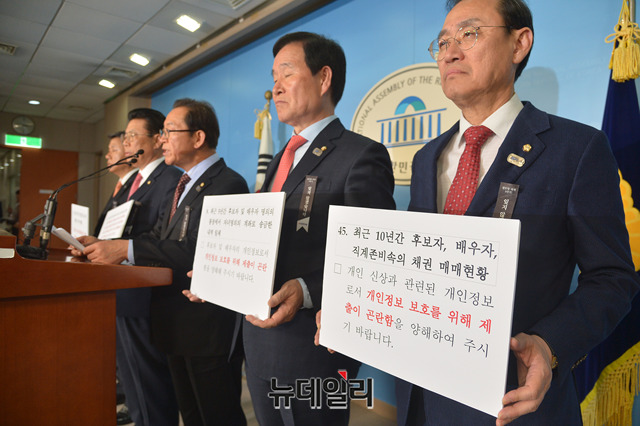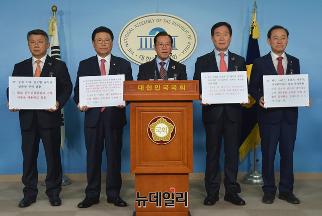 이종배 의원 및 자유한국당 산업통상자원중소벤처기업위원들이 26일 오후 국회 정론관에서 박영선 후보자의 불성실한 자료제출, 회피성 답변 등의 이유로 인사청문회 연기를 촉구하는 기자회견을 하고 있다.